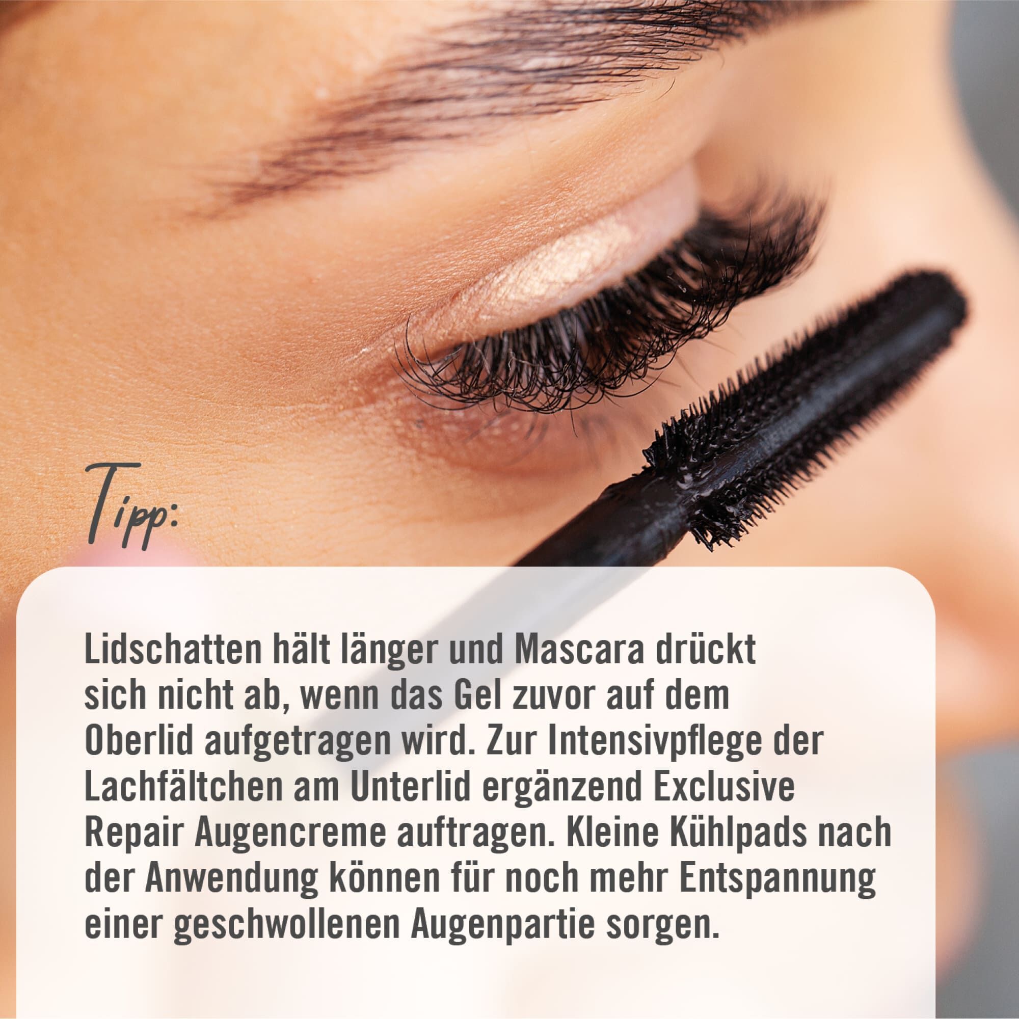 Tipp: Lidschatten hält länger und Mascara drückt sich nicht ab, wenn das Gel zuvor auf dem Oberlid aufgetragen wird. Zur Intensivpflege der Lachfältchen am Unterlid ergänzend Exclusive Repair Augencreme auftragen. Kleine Kühlpads nach der Anwendung können für noch mehr Entspannung einer geschwollenen Augenpartie sorgen.